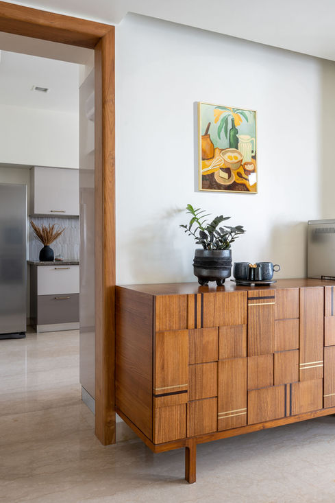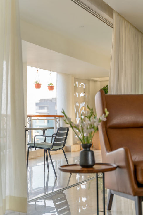Set in Khar west of Mumbai, this 4000 square feet 3 bedroom apartment project is a humble attempt at achieving as much creative application of design within the set framework of a space. The space is beautifully hugged by a spacious balcony throughout its perimeter, making the house naturally smile with a gush of ambient natural light. What makes a house a home? The answer lay in introducing warmth and contentment through minimum colors, and letting the materials and textures speak for themselves. The natural warm tonality set by the light flowing into the house is something we aimed to compliment with wood and brass, across the soft white canvas of the walls and flooring. The subtle soft furnishings delightfully compliment the earthiness of the wood to create a harmonious ambience. The neutral color palette is humbly offset by the lush green plants peeking from cozy corners, all the while adding a playful pop of color combined with the carefully selected art, curios, and accessories.